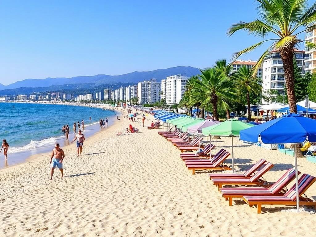 Центральный пляж — это сердце курорта. Здесь сходятся пульс города и морской шум набережной: кафе, рестораны, лавки с сувенирами и непрерывное движение отдыхающих. Я помню свой первый день на длинной песчаной полосе: солнце, запах моря и городские крики чаек над головой. Вода обычно теплая и спокойная, пологий вход подойдёт для семей с маленькими детьми, а значит — можно не бояться заныривать вместе с малышами.